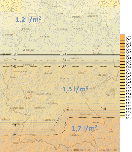 Heute regnete es im Norden zeitweise. Die Niederschlagsmengen liegen dabei zwischen 1 und 12 Liter pro Quadratmeter. Am Alpenrand treten anfangs noch einige Schauer auf. Sonst bleibt es niederschlagsfrei.