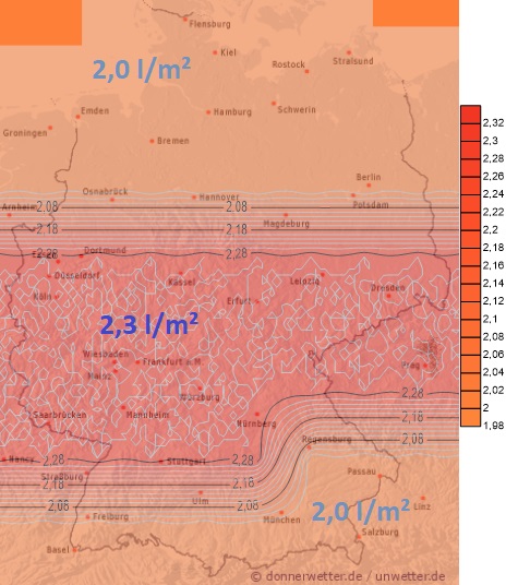 Ab Dienstag muss wieder gebietsweise mit Regen oder Schauern, sowie örtlichen Gewittern gerechnet werden. Dabei können teilweise über 10 Liter pro Quadratmeter fallen. Die Temperaturen gehen insgesamt etwas zurück.