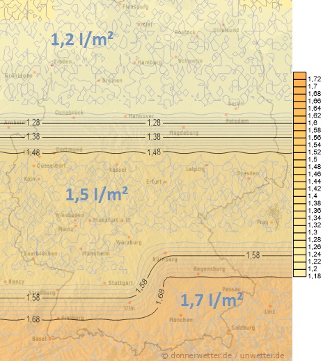 Am Freitag fällt wieder häufiger Regen oder es gehen örtlich kräftige Schauer und Gewitter nieder. Die Niederschlagsmengen liegen dabei zum Teil zwischen 5 und 25 Liter pro Quadratmeter. Im Südwesten bleibt es jedoch bis auf wenige Ausnahmen niederschlagsfrei.