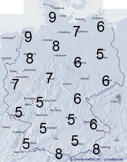 Nach einer kurzen Wetterberuhigung zieht gegen Abend im Nordwesten leichter Regen und Sprühregen auf. Sonst entsteht Benetzung durch nächtlichen Tau. Die Benetzungsdauer liegt allgemein zwischen 4 und 7 Stunden. Im Nordwesten, sowie an den Alpen zwischen 8 und 10 Stunden. Bei einer vorhandenen Schneedecke in den Bergen werden bis zu 24 Stunden erreicht.