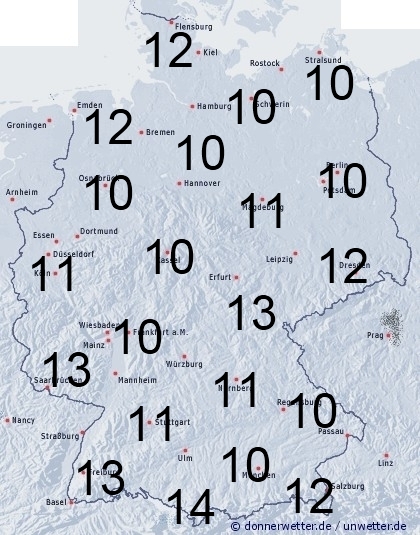 Eine Kaltfront mit Regen oder Schauern zieht heute über Deutschland. Trocken bleibt es vorläufig nur an Oder und Inn. Hier entsteht allerdings Benetzung durch nächtlichen Strahlungstau. Die Benetzungsdauer liegt allgemein zwischen 9 und 15 Stunden.