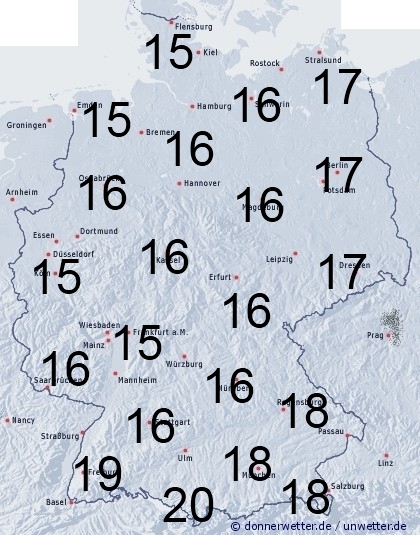 In Deutschland fällt zeitweise zum Teil kräftiger Regen. Die Benetzungsdauer liegt allgemein zwischen 14 und 20 Stunden. Bei einer noch vorhandenen Schneedecke in den Bergen werden bis 24 Stunden erreicht.