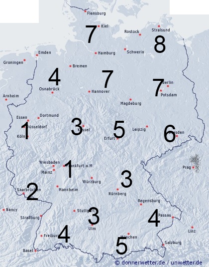 Die Benetzungsdauer liegt im Norden zwischen 4 und 8 Stunden, im Süden sind es 3 bis 5 Stunden. Am niedrigsten ist die Benetzung im Westen und im Rhein-Main-Gebiet. Hier werden kaum mehr als eine Stunde erreicht.