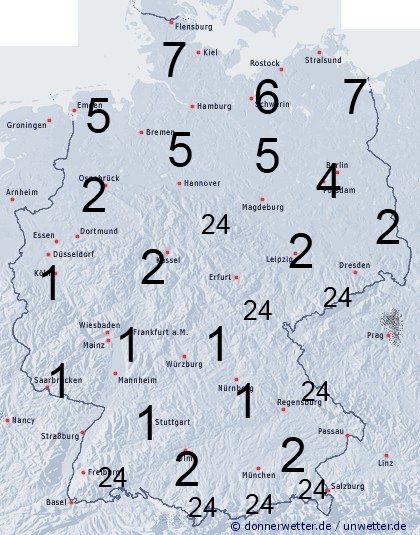 Die Benetzungsdauer liegt bei einer vorhandenen Schneedecke auf den Höhen der Mittelgebirge und an den Alpen bei 24 Stunden. In der Nordhälfte sorgt etwas Regen, oder einzelne Schauer für eine Benetzung von 4 bis 7 Stunden. Sonst entsteht leichte Benetzung nur durch nächtlichen Tau, beziehungsweise Reif.