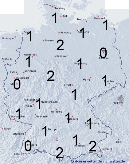 Über dem Nordwesten kann es örtlich durch etwas Regen zu einer leichten Benetzung von 1 bis 2 Stunden kommen. Sonst entsteht leichte Benetzung nur durch nächtlichen Strahlungstau.