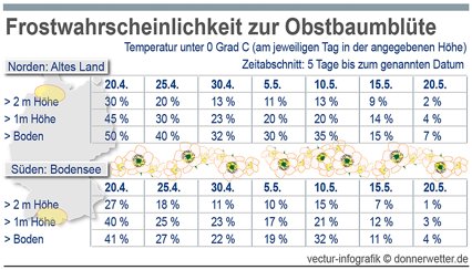 In der nachfolgenden Tabelle finden Sie die Frostwahrscheinlichkeit Nord / Süd zur Obstbaumblüte 2015!