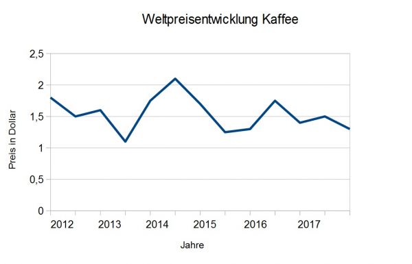 Kaffeepflanzen benötigen ein feuchtes, warmes Klima mit geringen Temperaturschwankungen wie in tropischen Regionen, deshalb wird er am meisten in Brasilien, Kolumbien, Vietnam, Indonesien, Indien und Mexiko angebaut. Größter Abnehmer sind die USA und Europa. Preisschwankungen entstehen durch die Empfindlichkeit der Pflanze, welche die Ernte sehr variabel ausfallen lässt. Des Weiteren trägt hier auch die politische Lage in Entwicklungsländern zur Preisbildung bei.