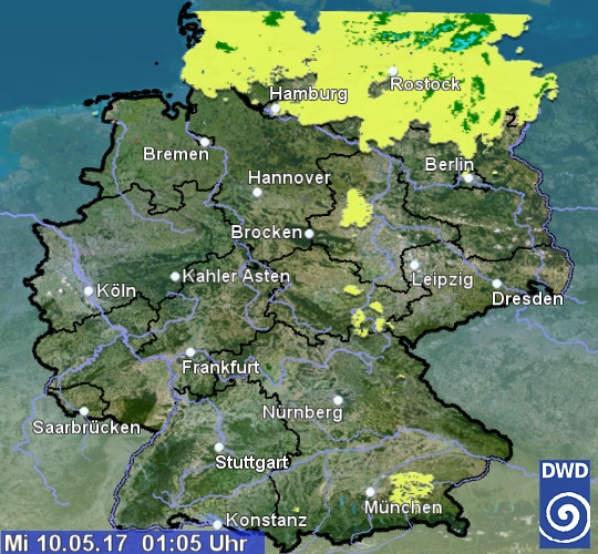 Das Radarbild zeigt aktuell in Schleswig-Holstein und Mecklenburg-Vorpommern leichte Regensignale an. Sonst ist es vielfach trocken und teilweise auch sternenklar.