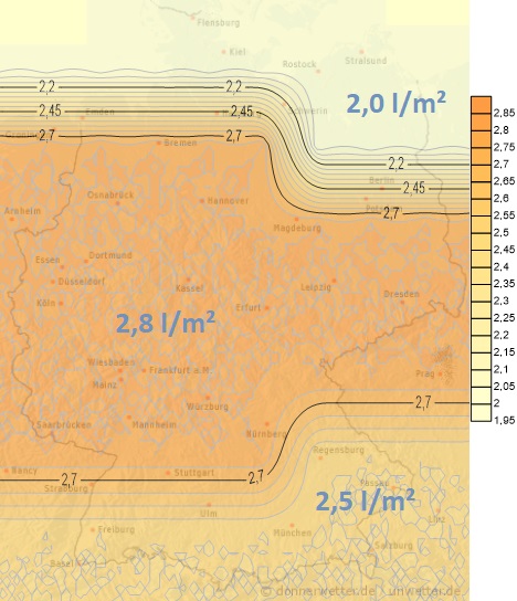 Am Montag überquert uns von Westen eine Kaltfront mit teils kräftigen schauerartigen und gewittrigen Regenfällen. Dabei können Niederschlagsmengen zwischen 5 und 20 Liter pro Quadratmeter, örtlich auch mehr auftreten.