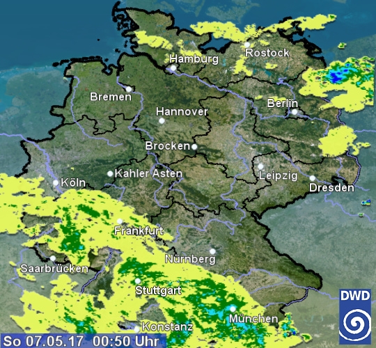 Das Radarbild zeigt aktuell im Südwesten und Süden verbreitet leichte bis mäßige Signale an. Aber auch an der polnischen Grenze nordöstlich von Berlin erkennt man ein räumlich eng begrenztes aber recht intensives Regenecho.