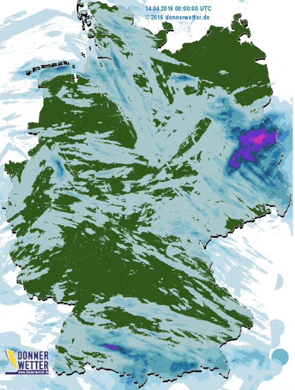 Chaotisches Bild auf der Radarkarte von gestern. Es gab einzelne Schauerspuren in Deutschland. Das Wetter war sehr wechselhaft, aber die Regenmengen waren sehr gering. Nur Ostdeutschland und am Alpenrand gab es mehr Regen.