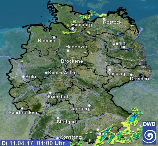 Das Radarbild zeigt aktuell noch einige mäßige Niederschlagssignale im südöstlichen Bayern. Bei München und Passau hat es vor kurzer Zeit auch noch geblitzt und gedonnert. Außerdem sind bei Hamburg und Rostock noch einzelne leichte Regenechos zu erkennen. Hier sind heute tagsüber einzelne Schauer unterwegs. Auch an den Alpen kann es noch schauern. In der Mitte regnet es trotz der gelben Radarfarbe kaum.