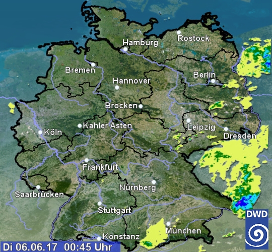 Das Radarbild zeigt aktuell noch einige schwache Schauersignale im Osten und im südlichen Bayern. Sonst ist der Himmel über Deutschland teils bewölkt, teils sternenklar. Im Süden haben sich vermehrt Nebelfelder gebildet.