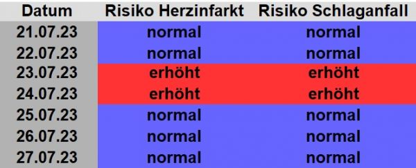 Die Schlaganfall- und Herzinfarktrisiken bis zum 27.07.2023.