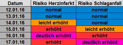 Seit Jahren ist bekannt, dass atmosphärische Veränderungen zu einer Häufung von Schlaganfällen und Herzinfarkten führen können. Insbesondere bei schnellen Änderungen von Temperaturen kommt es einem Anstieg von Fällen bei Risikopatienten. Besonders Menschen mit Vorerkrankungen sind betroffen. Das Wetter ist allerdings nicht die Ursache des Herz- Kreislaufproblems, sondern Vorschädigen zusammen mit Wetterstress führen zum akuten Auslösen des Herzinfarktes oder Schlaganfalles.