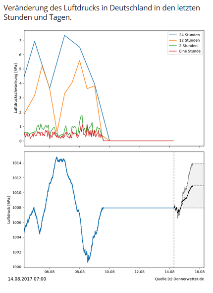Unsere Grafiken umfassen den Luftdruckverlauf in unterschiedlichen Zeitkurven ( eine Stunde, zwei Stunden, 12 Stunden, 24 Stunden) sowie eine Rückschau und Prognose für die kommenden zwei Tage.