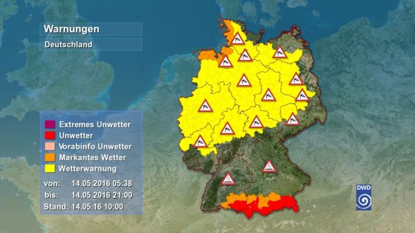 Die aktuelle Warnlage mit der Warnung vor dem starkem Regen am Alpenrand. Bis zum Abend zieht er sich in die Alpen zurück.