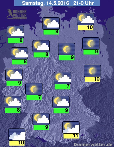 Am Abend und in der Nacht klart es dann im ganzen Land etwas auf. Die Schauer lassen nach und es ist zum Teil nur leicht bewölkt oder, im Osten, sogar sternenklar. Die Temperaturen sinken in der ersten Nachthälfte auf 7 Grad in der Mitte des Landes und 11 Grad am Alpenrand. Dazu weht nach wie vor ein teils starker Wind aus nordwestlicher Richtung.
