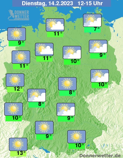 Heute Nachmittag scheint verbreitet die Sonne und es ziehen lediglich im Osten und Nordosten auch mal ein paar dichtere Wolken durch. Im übrigen Land sind es nur lockere Wolken oder es ist sogar wolkenlos. Es bleibt trocken bei Werten von 7 Grad auf Rügen und bis 13 Grad am Oberrhein.