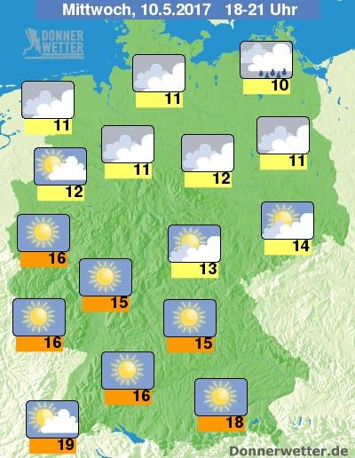 Heute Nachmittag strahlt im Süden und Westen verbreitet die Sonne von einem zumeist stahlblauen Himmel, dabei bleibt es trocken. Größtenteils dichte Wolken halten sich über dem Norden, Nordosten und Osten Deutschlands, dazu bilden sich von Brandenburg bis nach Mecklenburg-Vorpommern zeitweise Schauer, sonst bleibt es trocken. Die Temperatur steigt auf 10 bis 13 Grad im Norden und Osten, sonst auf 13 bis 18 Grad.
