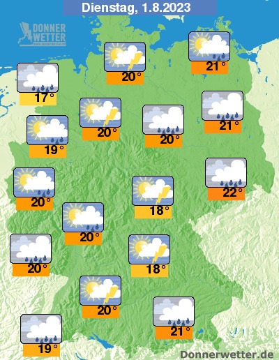 Am Dienstag ziehen oft dichte Wolken übers Land hinweg, zumindest zwischendurch können sich aber auch Auflockerungen zeigen. Es bilden sich allerdings immer wieder Schauer. Über der Südhälfte sind zudem auch örtliche Gewitter möglich. Die Temperatur erreicht 17 Grad am Niederrhein und bis 21 Grad an der Oder.