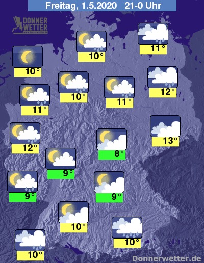 Während der zweiten Nachthälfte treten in der Regel nur im Süden noch Schauer auf, sonst wechseln sich Wolken, Halbmond und Sterne miteinander ab. Insbesondere im Nordwesten klart der Himmel auch für längere Zeit auf.
