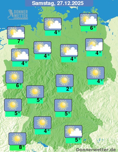 Am Samstag ist es verbreitet heiter oder vor allem über der Südhälfte auch weitgehend nur sonnig. Vom Norden bis zur Landesmitte können im Tagesverlauf zum Teil dichte Wolken durchziehen, dabei bleibt es aber meist trocken. Die Temperatur erreicht 2 Grad in Erfurt und bis 8 Grad in Freiburg.