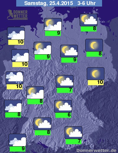 Am Samstag ziehen in der Westhälfte der Republik verbreitet dichte Wolken durch, dazu fällt zeitweise Regen. In der Osthälfte Deutschlands ist es vormittags noch meist aufgelockert, teils auch noch locker bewölkt und weitgehend trocken, am Nachmittag ist es aber auch hier meist stark bewölkt, dazu fällt gegen Abend auch gebietsweise Regen. In den östlichsten Landesteilen bleibt es aber überwiegend trocken. Die Temperatur steigt auf 12 Grad an der Nordsee und 23 Grad in Dresden.