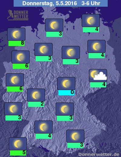 In der kommenden Nacht sind im Bereich der Donau und der Neiße zum Teil noch einige Wolken unterwegs, die jedoch keinen nennenswerten Regen bringen. Im großen Rest der Republik zeigt sich hingegen ein sternenklarer Nachthimmel, dabei bleibt es natürlich trocken. Die Temperatur sinkt auf recht milde 8 Grad an der Nordseeküste und bis auf teils kalte 0 Grad im Eichsfeld.
