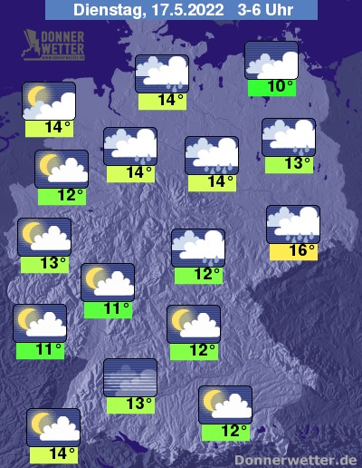In der Nacht zum Dienstag halten sich über der Nordosthälfte Deutschlands weitgehend kompakte Wolken und es bilden sich vielerorts Schauer. Weiter nach Südwesten hin zeigt sich der Himmel dagegen größtenteils locker bewölkt oder sternenklar, hier bleibt es trocken. Die Temperatur sinkt auf 16 Grad in Dresden und bis 10 Grad in Neubrandenburg.