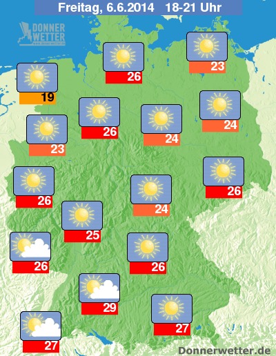 Am Abend liegen die Temperaturen immer noch im Wohlfühlbereich bei verbreitet um 25°C. Vor allem an der Nordsee ist es aber auch etwas frischer.