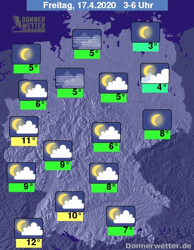 Bis zu den Frühstunden kühlt die Luft auf 3 bis 9 Grad ab. Bodenfrost tritt nur noch vereinzelt auf. Im Südwesten, sowie in den Städten Westdeutschlands halten sich die Temperaturen teilweise sogar im zweistelligen Bereich.