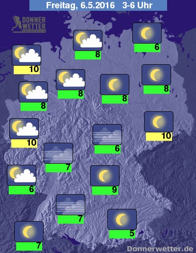 In der Nacht zum Freitag bleibt der Himmel über der Südosthälfte praktisch druchweg sternenklar. Über den Norden und Westen ziehen jedoch auch hier und da einige Wolkenfelder durch, es bleibt jedoch überall trocken. Die Tiefstwerte liegen bei etwa 10 Grad in Düsseldorf und um 5 Grad in der bayerischen Landeshauptsatdt.