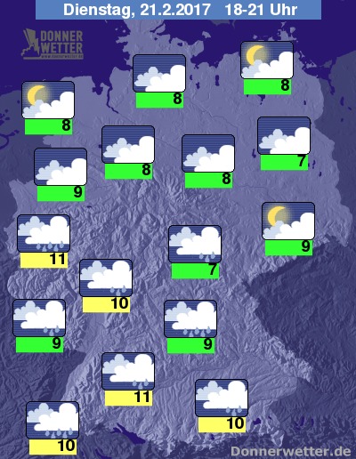 Heute Abend lockert es im Umfeld von Nord- und Ostsee verbreitet auf, im übrigen Norden ist es zwar meist stark bewölkt, aber zumindest trocken. Weiter nach Süden hin fällt bei dichten Wolken dagegen zeitweise Regen. Die Abendwerte liegen zwischen 7 Grad im südlichen Brandenburg und etwa 11 Grad im Rheinland.