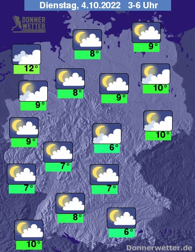 In der Nacht zum Dienstag ist es oft locker bis aufgelockert, vor allem über der Nordhälfte jedoch auch oft stark bewölkt, dazu bleibt es weitgehend trocken. Die Temperatur sinkt auf 12 Grad an der Nordsee und 6 Grad in Oberbayern.