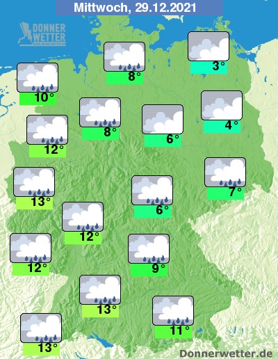 Am Mittwoch bleibt es weitgehend bedeckt, vor allem über der Osthälfte ist es zudem oft neblig-trüb, jedoch weitgehend trocken. Über der Westhälfte fällt zeitweise Regen, während es weiter nach Osten hin meist trocken bleibt. Die Temperatur steigt auf 3 Grad an der Müritz und bis 13 Grad entlang des Rheins.