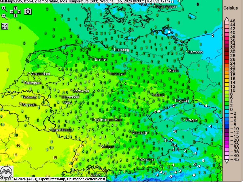Die Temperaturen erreichen am Nachmittag Höchstwerte um 2 Grad im Nordosten und bis 14 Grad am Oberrhein.
