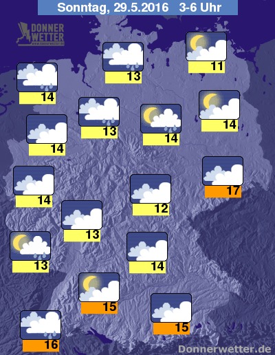 In der Nacht zum Sonntag bilden sich zunächst vor allem über der Westhälfte und in der Mitte Deutschlands noch gebietsweise Schauer und einzelne Gewitter. In den östlichen Landesteilen bleibt es bei teils starker, teils aufgelockerter Bewölkung überwiegend trocken. Im weiteren Nachtverlauf bleibt es auch nach Westen hin mehrheitlich trocken, bevor sich gegen Morgen im Süden und Südwesten teils kräftige Schauer und Gewitter entwickeln, sonst bleibt es zumeist trocken. Die Temperatur sinkt auf 17 Grad in Dresden und etwa 12 Grad im Grabfeld.