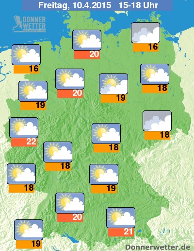Heute Nachmittag herrscht verbreitet heiteres und trockenes Wetter, dabei können die Wolken insbesonders im Ostseeküstenumfeld sowie rund ums Erzgebirge auch teils dicht sein, Regen fällt aber auch hier keiner. Gebietsweise zeigen sich auch sonnige Abschnitte. Die Temperaturen liegen bei 16 Grad im nördlichen Emsland und frühsommerlich warmen 22 Grad in der Kölner Bucht.