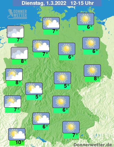 Heute Nachmittag ist es besonders im Süden und Osten überwiegend sonnig, ansonsten nimmt die Bewölkung von Nordwesten her aber nach und nach zu und im Verlauf zieht es sich auch oft komplett zu. Es bleibt landesweit trocken bei Werten von 5 Grad im Grabfeld und bis 10 Grad im Breisgau.