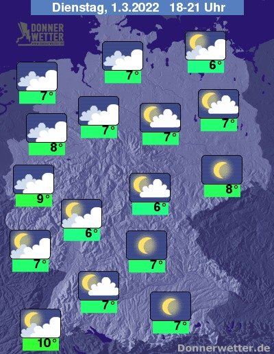 Heute Abend ist der Himmel nur noch über Bayern und Sachsen sternenklar, sonst ziehen von Nordwesten her mehr und mehr und nachfolgend auch dichte Wolken durch, dazu bleibt es trocken. Die Temperatur liegt bei 6 Grad in Erfurt und bis 10 Grad in Freiburg.