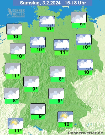 In den Nachmittags- und Abendstunden bleibt der Himmel über weiten Landesteilen stark bewölkt oder es ist bedeckt, Auflockerungen beschränken sich in den nächsten Stunden vor allem auf den äußersten Süden. Vor allem in der Nord- und Osthälfte fällt zeitweise etwas Regen, in den übrigen Landesteilen bleibt es meist trocken.