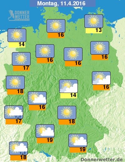 Am Montag ist es zunächst verbreitet heiter bis sonnig und dabei trocken, gegen Abend können sich im Südwesten jedoch einzelne Schauer und teils auch Gewitter entwickeln, sonst bleibt es bei einigen Wolken jedoch trocken. Die Temperatur steigt auf 13 bis 20 Grad.