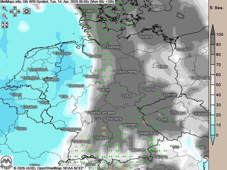 Am Dienstag zeigt sich der Himmel über weiten Landesteilen wolkig, dabei muss vor allem im Osten und Südosten zeit- und gebietsweise mit etwas Regen oder Schauern gerechnet werden. Im Westen und Nordwesten ist es meist heiter bis wolkig und es bleibt meist niederschlagsfrei.