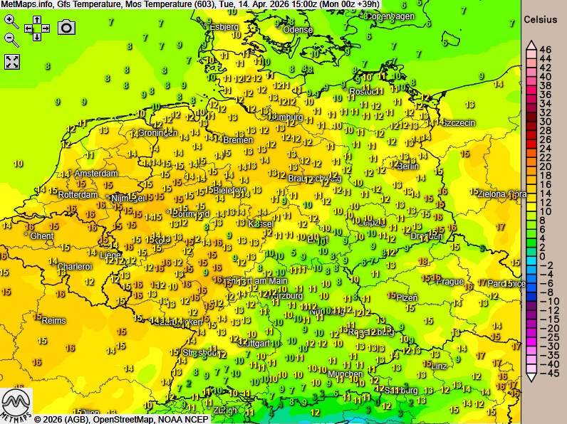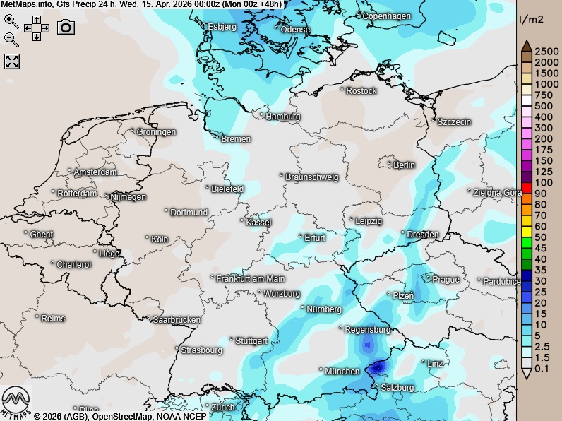 Die Wetterkarte für 06:00 Uhr, die Lufttemperaturen um 15:00 Uhr sowie die 24-Stunden-Regenmengen nach GFS: