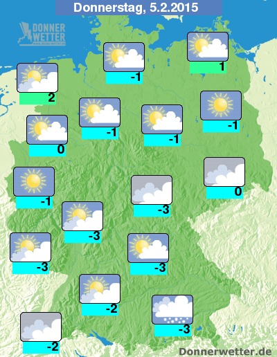 Am Donnerstag bleiben vor allem im Stau der Alpen die Wolken überwiegend dicht und es schneit zeitweise, aber auch in der Mitte und im Osten des Landes halten sich oft dichte Wolken, hierbei fällt allerdings nur gelegentlich etwas Schnee. In den anderen Landesteilen ist es zumeist locker bis aufgelockert bewölkt und dabei trocken. In weiten Teilen Berlin-Brandenburgs und Westdeutschlands ist es zeitweise sogar sonnig. Die Temperatur steigt auf -3 Grad in München und bis 2 Grad an der Nordseeküste.