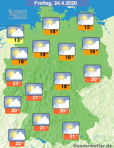 Die Höchsttemperaturen liegen im Norden zwischen 13 und 20 Grad, im Süden und Westen werden weiterhin frühlingshaft warme 20 bis 25 Grad erreicht.