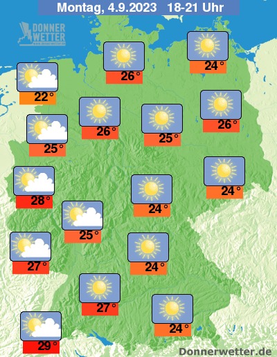 Heute Abend sind in den westlichen Landesteilen oft lockere Wolkenfelder unterwegs, sonst scheint die Sonne aber von einem überwiegend wolkenlosen Himmel, dabei bleibt es trocken. Die Temperatur liegt bei 22 Grad in Wilhelmshaven und 29 Grad in Freiburg.