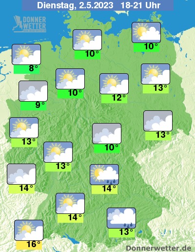Heute Abend klingen die Schauer auch im Süden nach und nach ab und die Sonne kommt insgesamt besser zum Zuge. Trotzdem ziehen gebietsweise auch weiter viele und teils dichte Wolken durch. Die Temperatur liegt bei 8 Grad in Wilhelmshaven und 16 Grad in Freiburg.