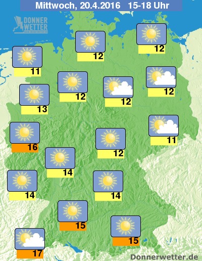 Am Donnerstag im Süden und Westen teils heiter, teils auch stark bewölkt, über der Nordosthälfte meist heiter bis sonnig, hier und da einige Wolken, trocken, 12 bis 20 Grad.